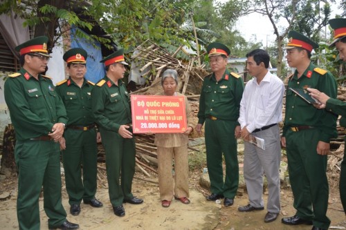 Thừa ủy quyền Bộ quốc phòng, Đại tá Trương Thiên Tô, Phó chủ nhiệm Cục chính trị quân khu 5 tặng quà hổ trợ cho Bà Nguyễn Thị Bưỡi, Thôn Hải Môn, xã Nghĩa Hiệp, huyện tư Nghĩa Bị sập nhà trong lũ lụt vừa qua