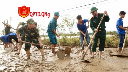 Cán bộ, chiến sĩ LLVT tỉnh tham gia khắc phục hậu quả lũ lụt năm 2017 tại xã Bình Minh, huyện Bình Sơn