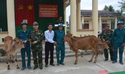 Ban chỉ huy quân sự huyện Nghĩa Hành và huyện Bình Sơn đã trao tặng bò giống cho 04 hộ nghèo ở xã Hành Phước và ở xã Bình Minh, huyện Bình Sơn. Cả 04 trường hợp được trao tặng bò giống lần này là cán bộ, chiến sĩ thuộc lực lượng dân quân cơ động, dự bị động viên có hoàn cảnh đặc biệt khó khăn. Mỗi hộ được tặng 01 con bò trị giá 15 triệu đồng. Trước đó BCHQS huyện Nghĩa Hành cũng đã trao tặng bò giống, trâu giống cho 02 hộ nghèo, hộ đồng bào dân tộc thiểu số ở xã Hành Tín Tây, vận động cán bộ chiến sĩ lực lượng vũ trang địa phương tham gia 120 ngày công giúp dân làm đường bê tông, tổng trị giá hơn 100 triệu đồng.