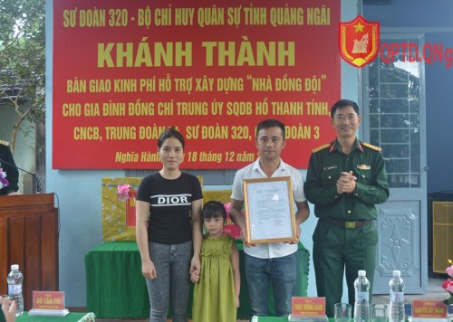 Nhân kỷ niệm 79 năm ngày thành lập Quân đội Nhân dân Việt Nam (22/12/1944 - 22/12/2023) và 34 năm Ngày hội Quốc phòng toàn dân (22/12/1989 - 22/12/2023), tuần qua, Sư đoàn 320 và Bộ CHQS tỉnh Quảng Ngãi đã tổ chức bàn giao 02 nhà đồng đội.