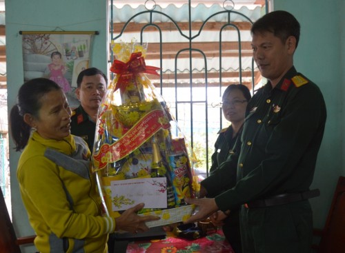 Tại các gia đình đến thăm, thay mặt cho Đảng ủy - Bộ chỉ huy quân sự tỉnh, đồng chí Đại tá Hà Đức Long, Phó Chính ủy Bộ chỉ huy quân sự tỉnh đã ân cần thăm hỏi, động viên thân nhân của các cán bộ, chiến sỹ và chúc các gia đình đón Tết Nguyên đán Kỷ Hợi đầm ấm, vui tươi; luôn công tác tốt và là hậu phương vững chắc để các cán bộ, chiến sỹ yên tâm hoàn thành nhiệm vụ mà Tổ quốc giao phó. và tặng 115 xuất quà, trị giá mỗi xuất quà là 1500.000 ngàn đồng với tổng kinh phí là 172 triệu 500 ngàn đồng, được trích từ nguồn kinh phí hỗ trợ của Ủy Ban nhân dân tỉnh Quảng Ngãi./.